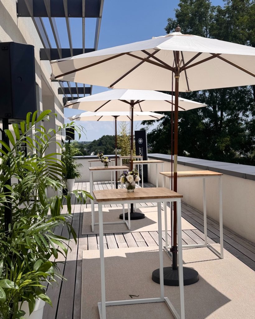 aménagement sur mesure des bureaux et du rooftop, logistique complète, coordination technique et service traiteur en partenariat avec Marcotullio.